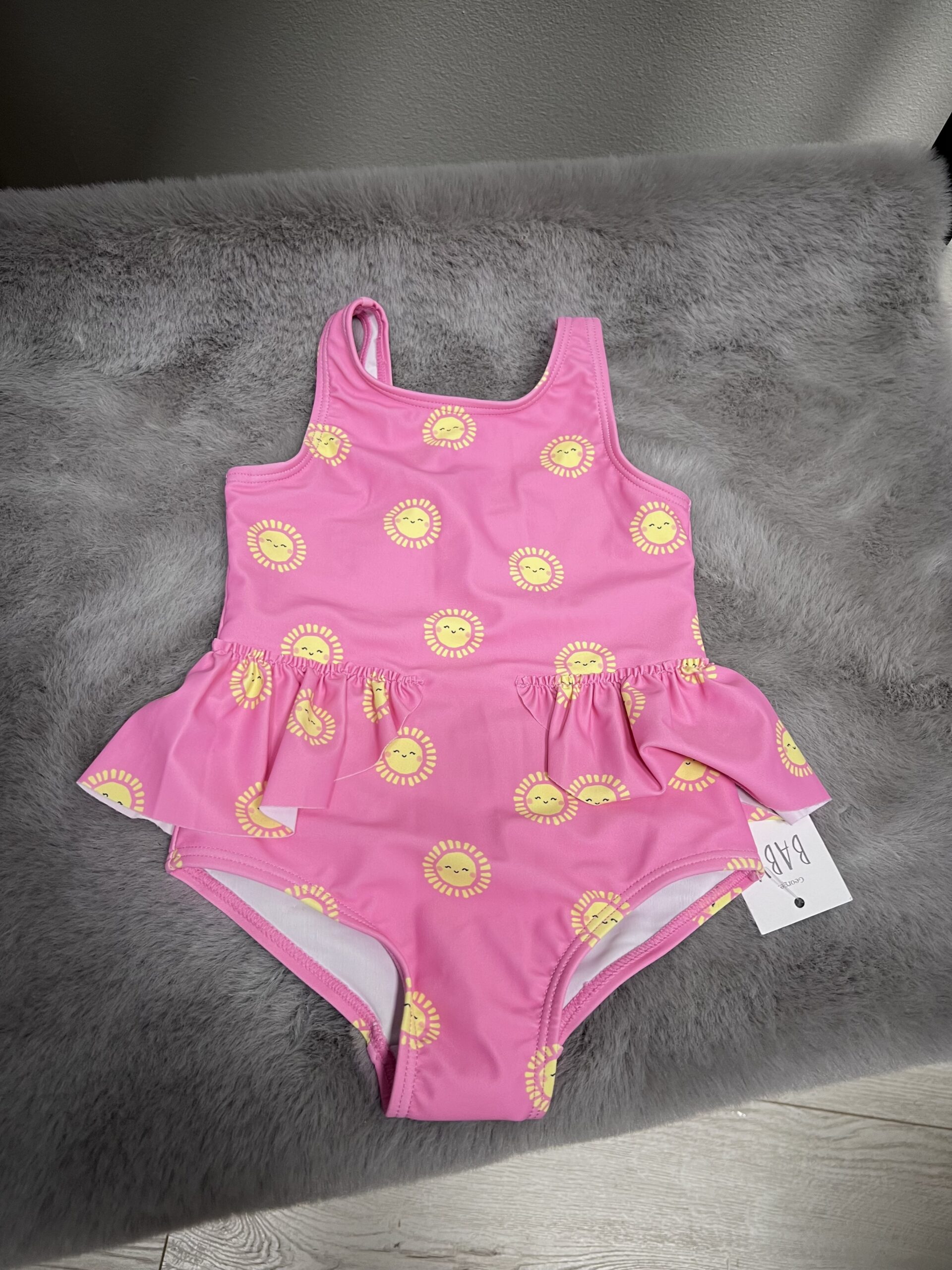 Armas ja suvine roosa beebi ujumistrikoo, mida kaunistavad rõõmsad kollased päikesed. Väike volang talje juures lisab trikoo disainile eriti armsa detaili.