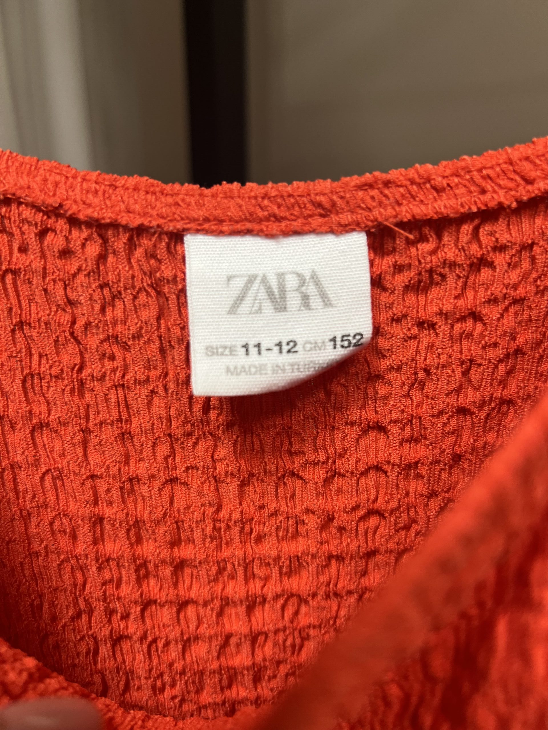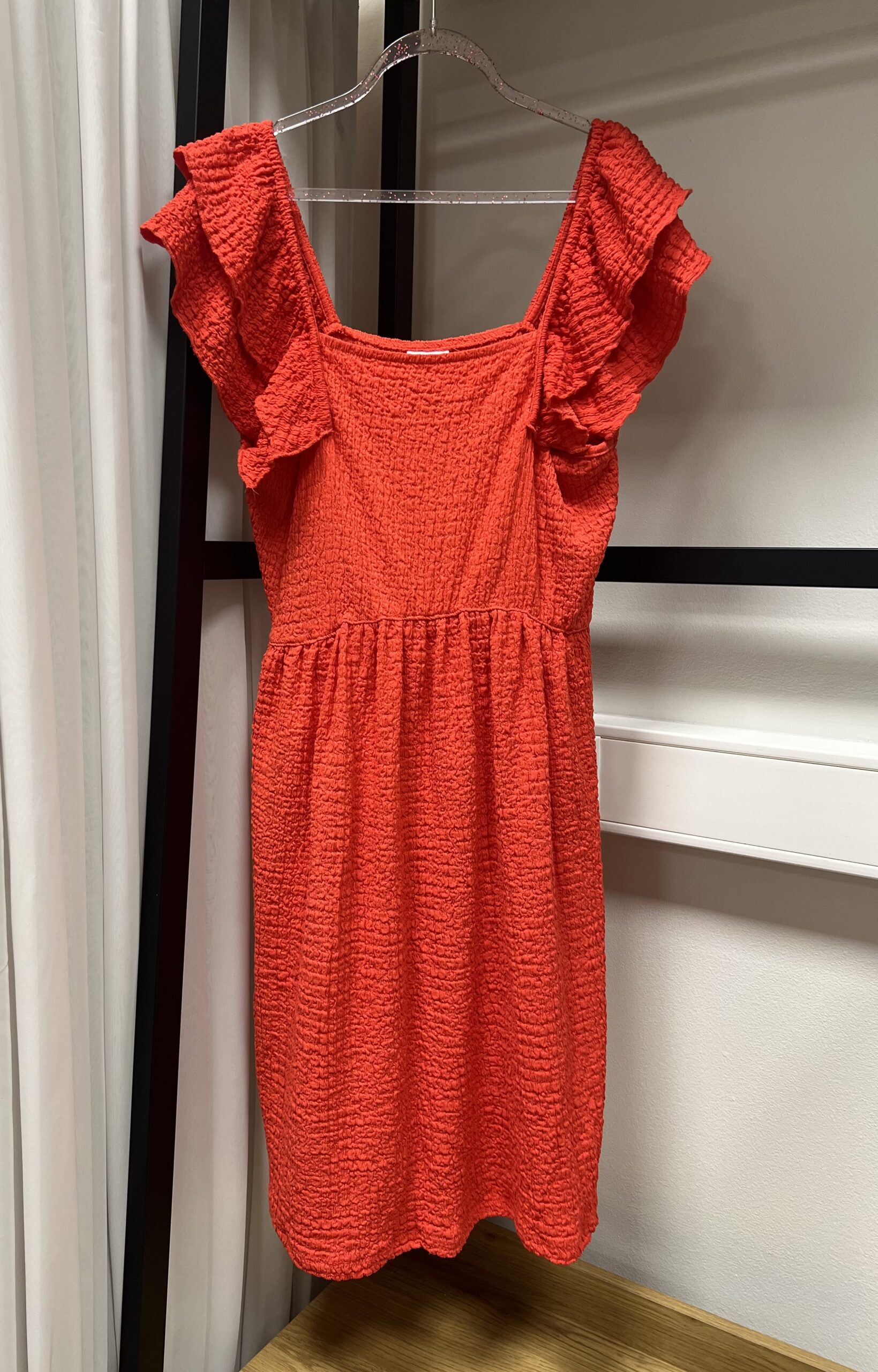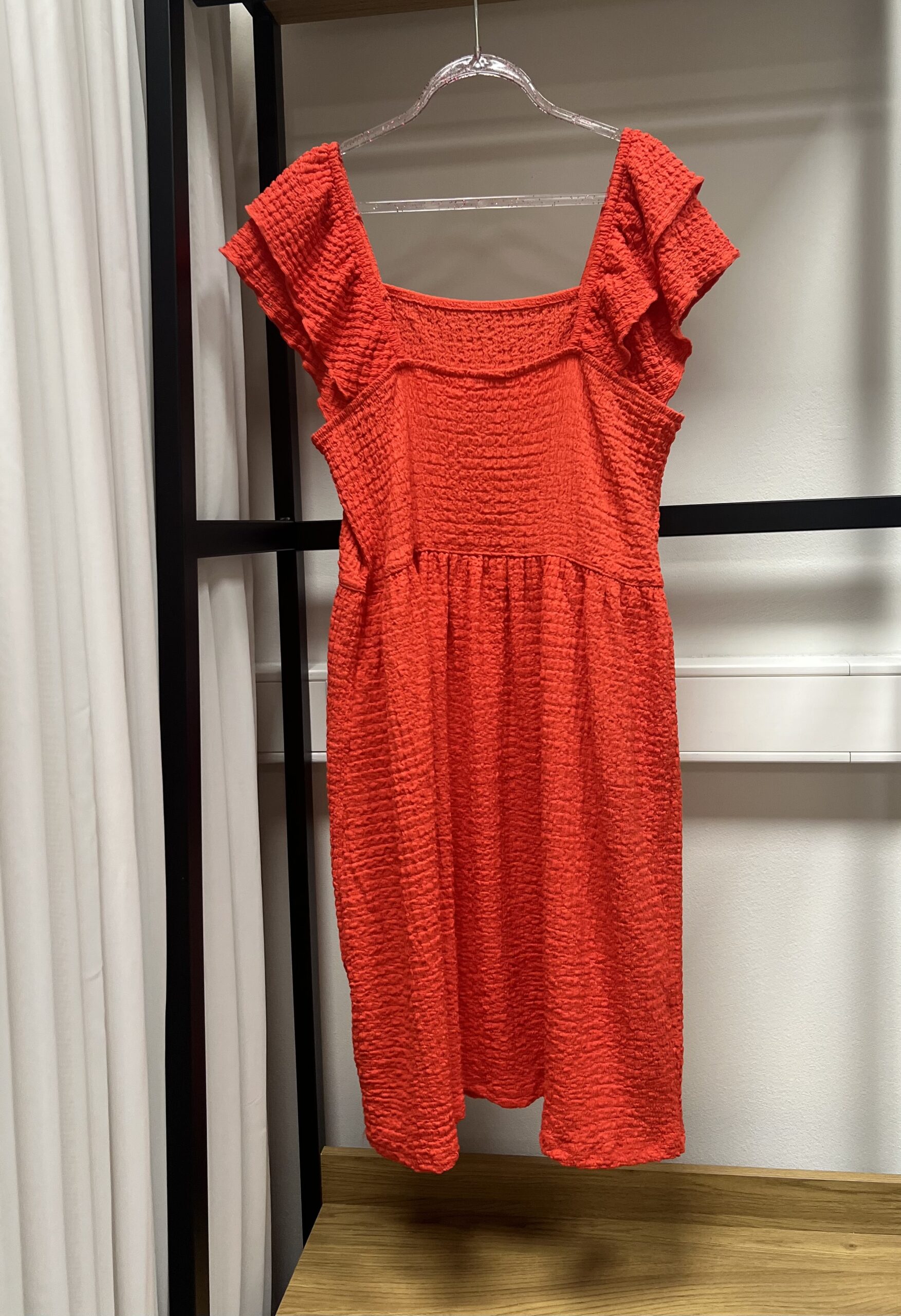 Erkpunane tekstuurse kangaga kleit, kaunite volang-varrukatega ja mugava lõikega. Sobib nii igapäevaseks kandmiseks kui ka pidulikumaks puhuks.
