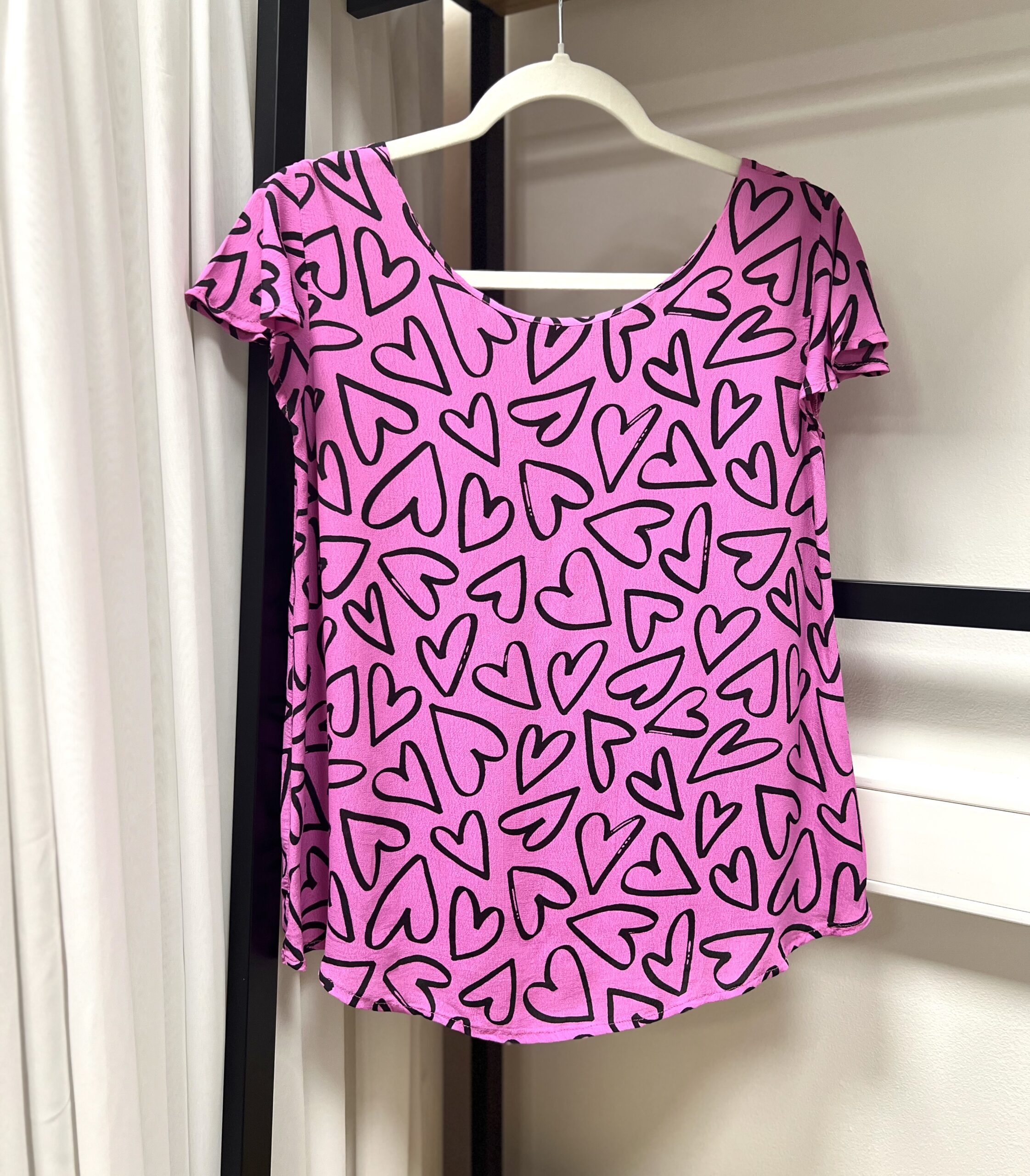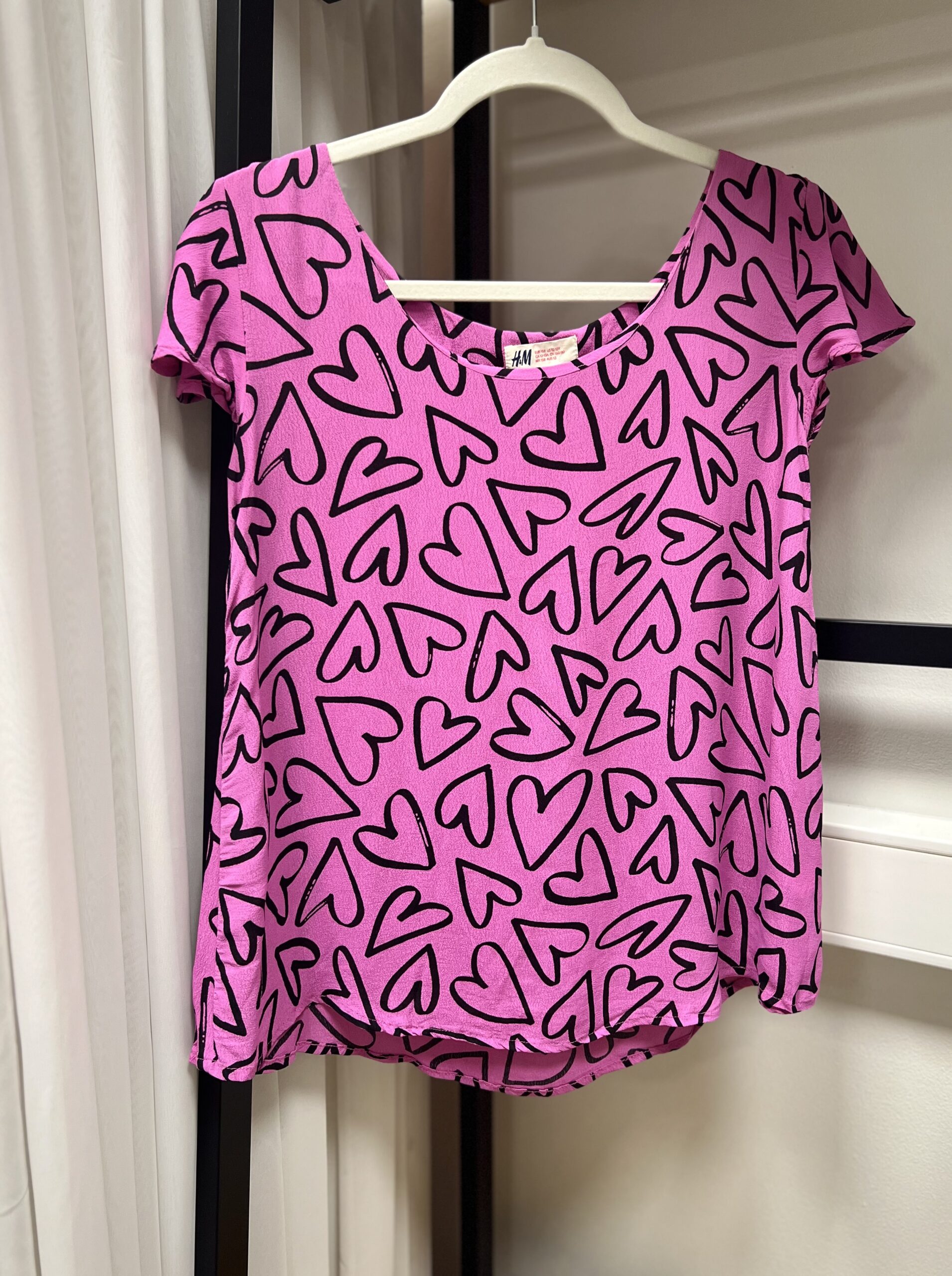 Silmapaistev roosa T-särk musta südame-mustriga. Pehme ja kerge materjal tagab mugava kandmise nii koolis kui vabal ajal. Klassikaline lühikeste varrukatega lõige sobib hästi igapäevaseks stiiliks.