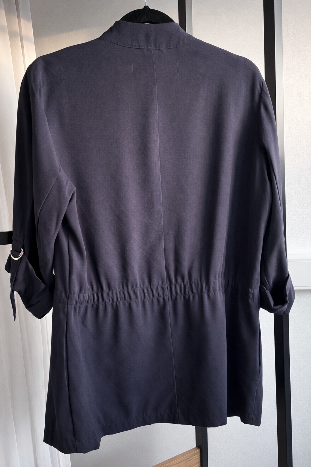 - Varrukad: üleskeeratavad, dekoratiivse kinnitusega